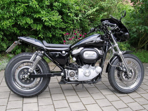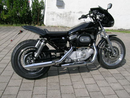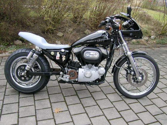 Im ersten Schritt des Umbaues blieb es noch bei einer Solo-Maschine. Die Sportster sollte aber ein grundsätzlich anderes Aussehen erhalten, also sportlicher werden. Hierzu erhielt sie im Heckbereich einen Breitreifenumbau von serienmässig 130/90 auf 180/70 und einen Umbau des Cockpits in Richtung der Buell Firebolt.