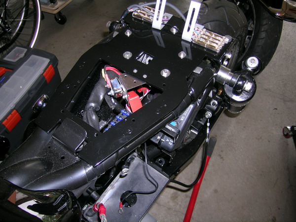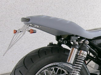 Das Heckteil wurde lackiert und verbaut. Im Anschluss wurde der Kennzeichenträger befestigt und die Elektrik im Heck verlegt, die Blinker sowie das Rücklicht und die Bremsleuchte angeschlossen. Der Kennzeichenträger wurde noch mit zwei VA-Rohren versteift, da sich beim Anbau schnell zeigte, dass bei späteren Vibrationen der gesamte Heckbereich und insbesondere der Kennzeichenträger sehr ins schwingen kommen würde.
