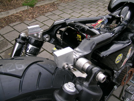 Alu-Aufsatzstücke aufgeschraubt wurden. Auf diesen soll dann die Alu-Grundplatte für die Sitzbefestigung und der Halter für den Innenkotflügel befestigt werden.